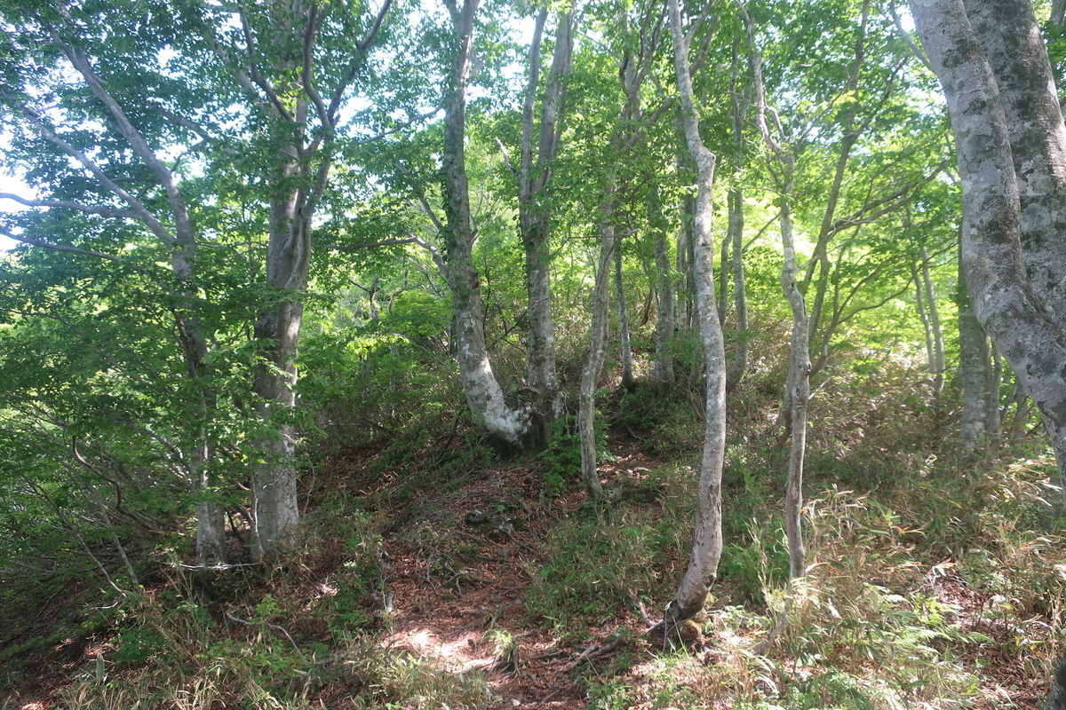 白倉岳(1270m)への稜線で視界が開けてきて景観は良くなるのですが、笹や小さい木などが茂っていて少し歩きにくかったです。